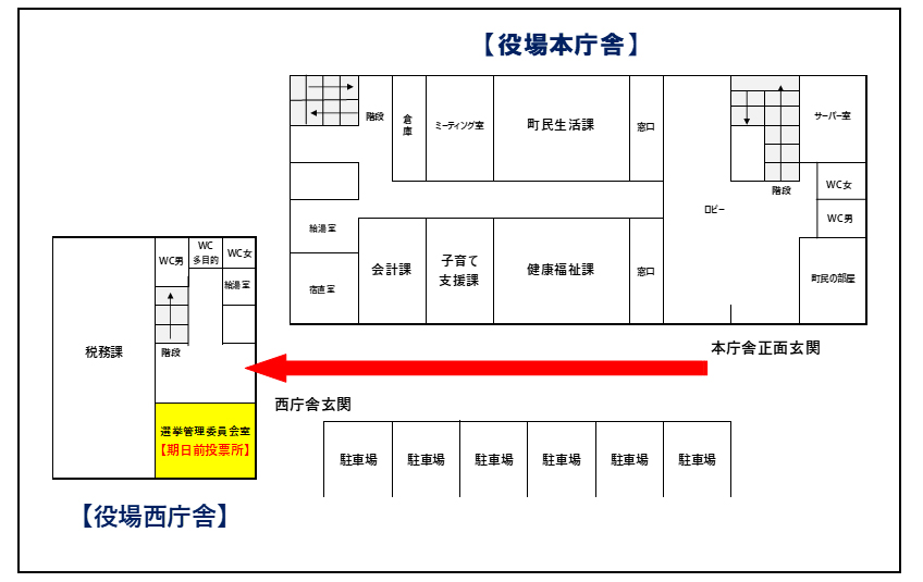 期日前投票の場所は、役場西庁舎1階選挙管理委員会室で行います。