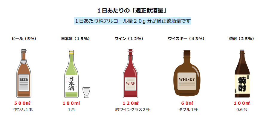 厚生労働省は、健康日本21(第3次)において、生活習慣病のリスクを高める飲酒量を、1日当たりの平均純アルコール摂取量を男性で40g、女性で20g以上と定義しています。また、健康日本21では「節度ある適度な飲酒」を1日当たりの純アルコール量で約20gとしています。なお、女性や高齢者、アルコール代謝能力の低い人はより少ない量が推奨されています。