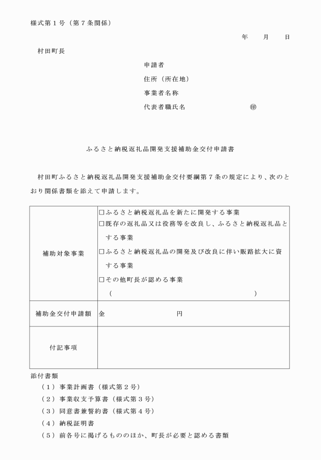 第7条 補助金の交付を受けようとする者(以下「申請者」という。)は、ふるさと納税返礼品開発支援補助金交付申請書(様式第1号。以下「交付申請書」という。)に次に掲げる書類を添えて町長に提出しなければならない。