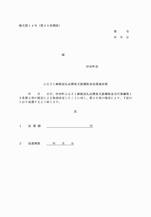 第20条 町長は、補助金の交付決定を取り消した場合は、交付決定者にふるさと納税返礼品開発支援補助金返還通知書(様式第14号)により補助金の返還を命ずるものとする。