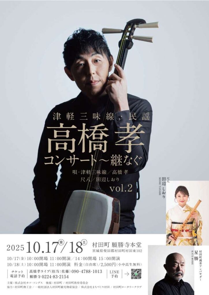 村田町親善アンバサダーの星勝氏が手掛ける「津軽三味線と民謡のコンサート」が願勝寺を会場に開催されます。