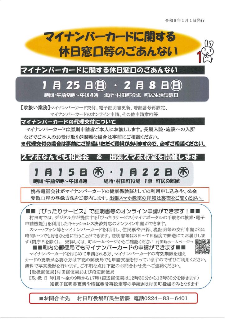 マイナンバーカード健康保険証利用申込、公金受取口座登録のほか携帯電話に関するご相談が出来ます。出張スマホ教室も同時開催しております。出張スマホ教室は、各回ともはじめて受講する方を優先させていただきます。詳細は、チラシをご覧ください。