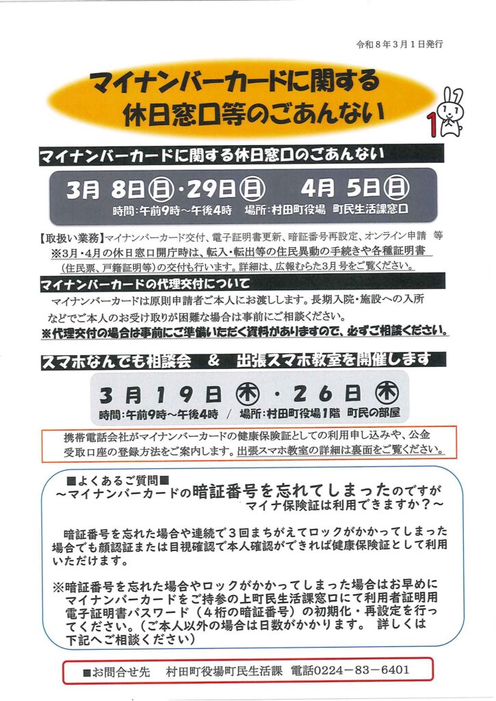 マイナンバーカード健康保険証利用申込、公金受取口座登録のほか携帯電話に関するご相談が出来ます。出張スマホ教室も同時開催しております。詳細はチラシをご覧ください。