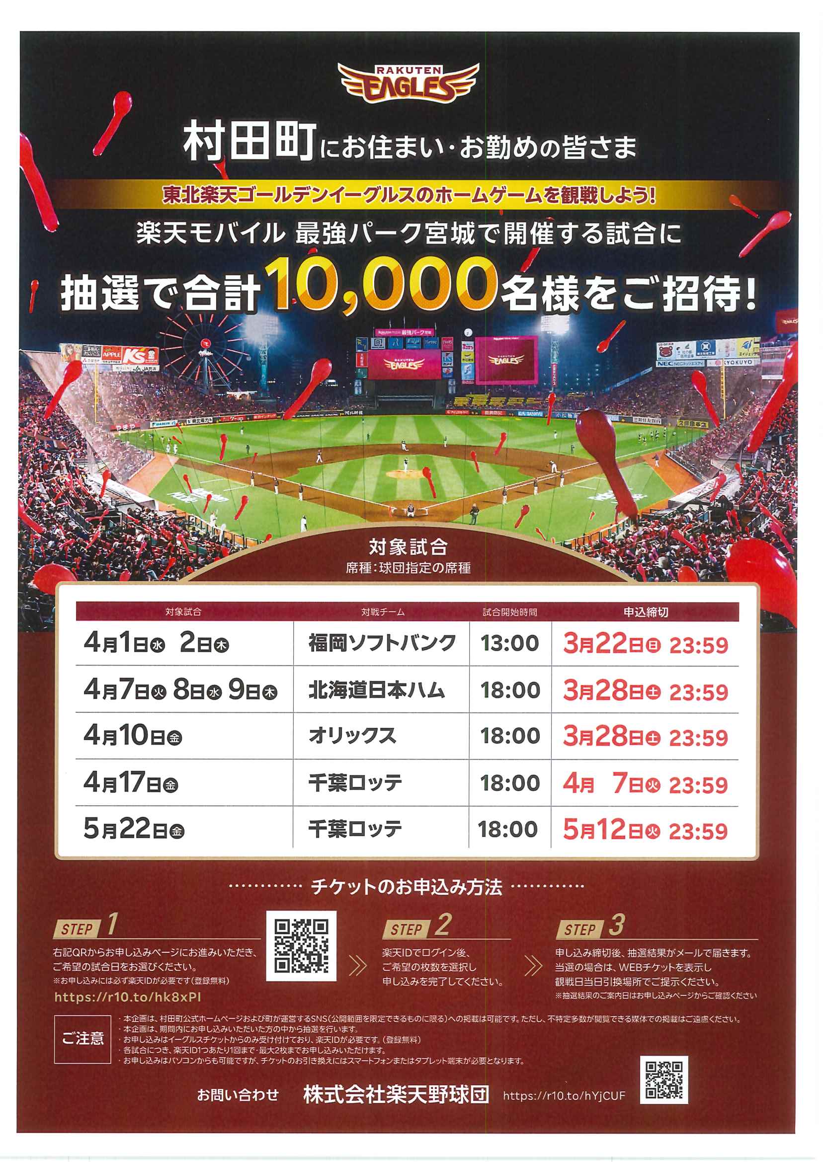 楽天イーグルスから村田町にお住まい・お勤めのみなさまへ野球観戦ご招待のお知らせです。